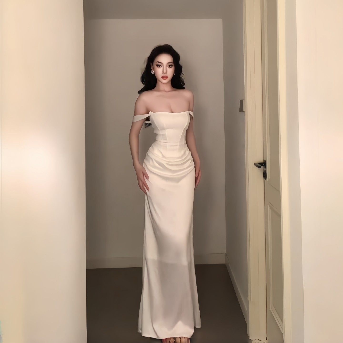 越南小众品牌DENIO 2025年秋季新款优雅纯白色一字肩礼服裙