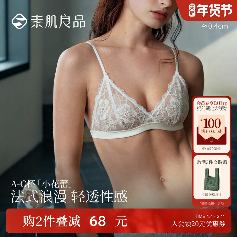 【小花蕾】素肌良品法式性感蕾丝美背内衣深V文胸薄款露背三角杯