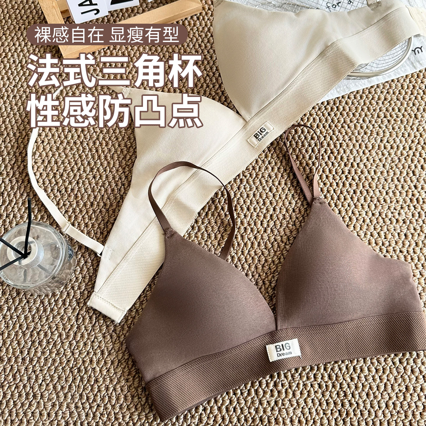 三角杯内衣女撞色小胸性感法式无痕无钢圈美背细肩带深v文胸套装