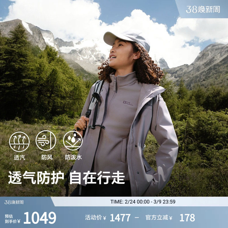JackWolfskin狼爪25秋冬新款DELHI女收腰抓绒三合一冲锋衣5120243