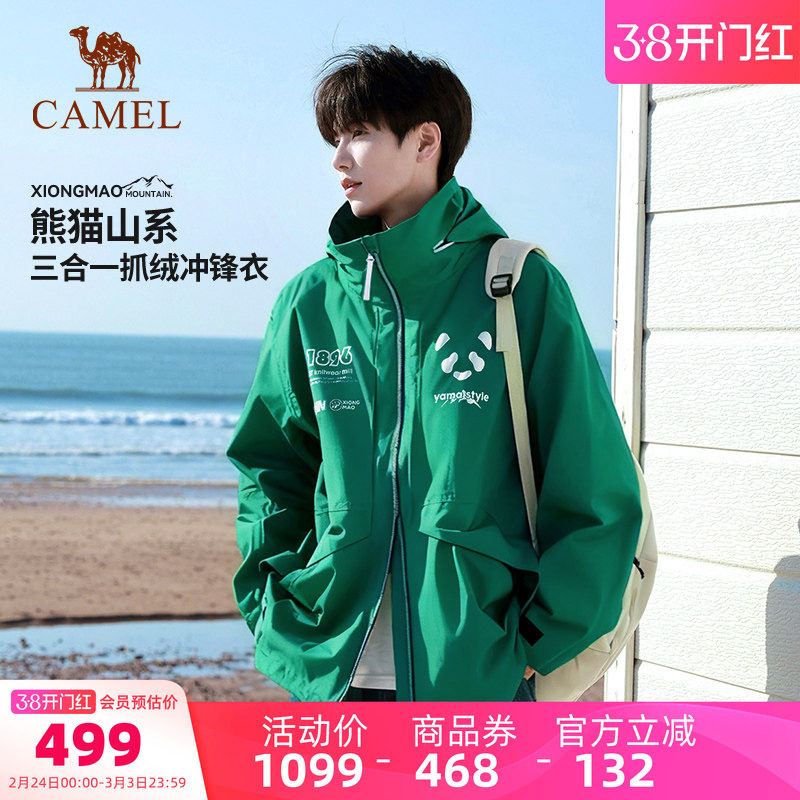 骆驼熊猫绿色三合一冲锋衣男秋冬加厚户外防水防风好看徒步外套女