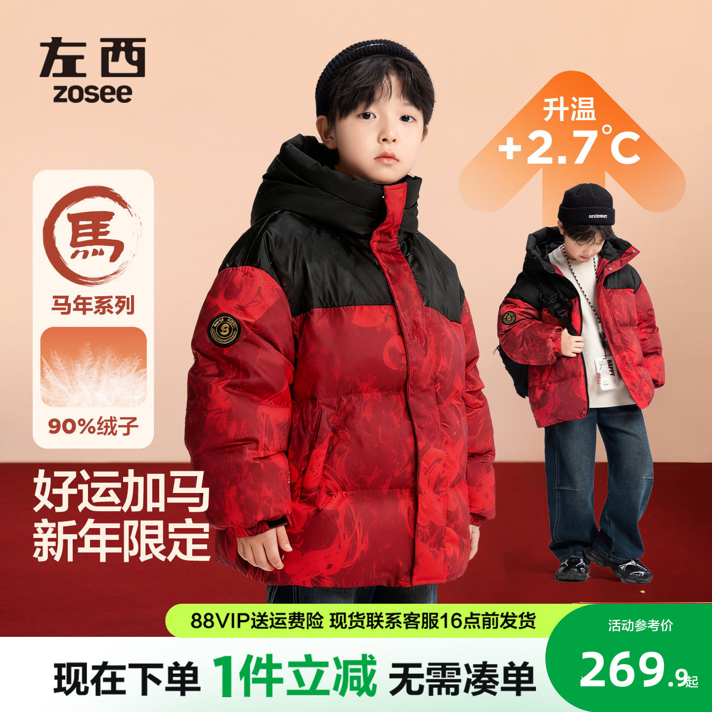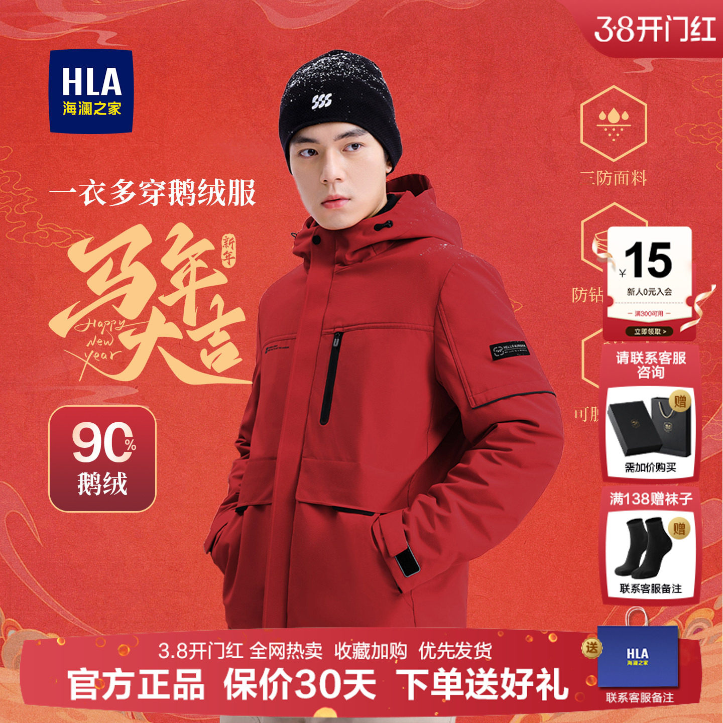 【曾舜晞同款】海澜之家马年本命年红色羽绒服冬季新款加厚外套男