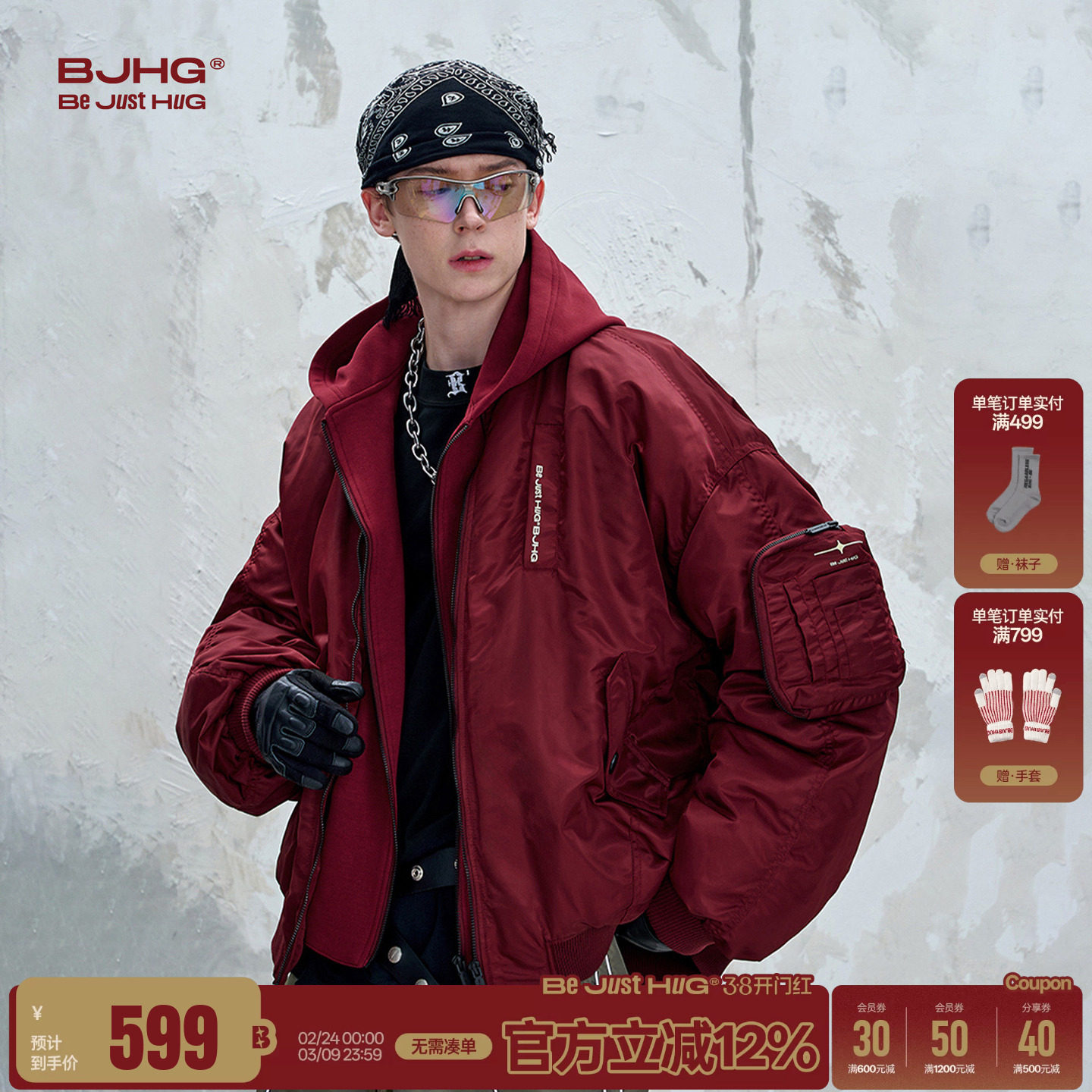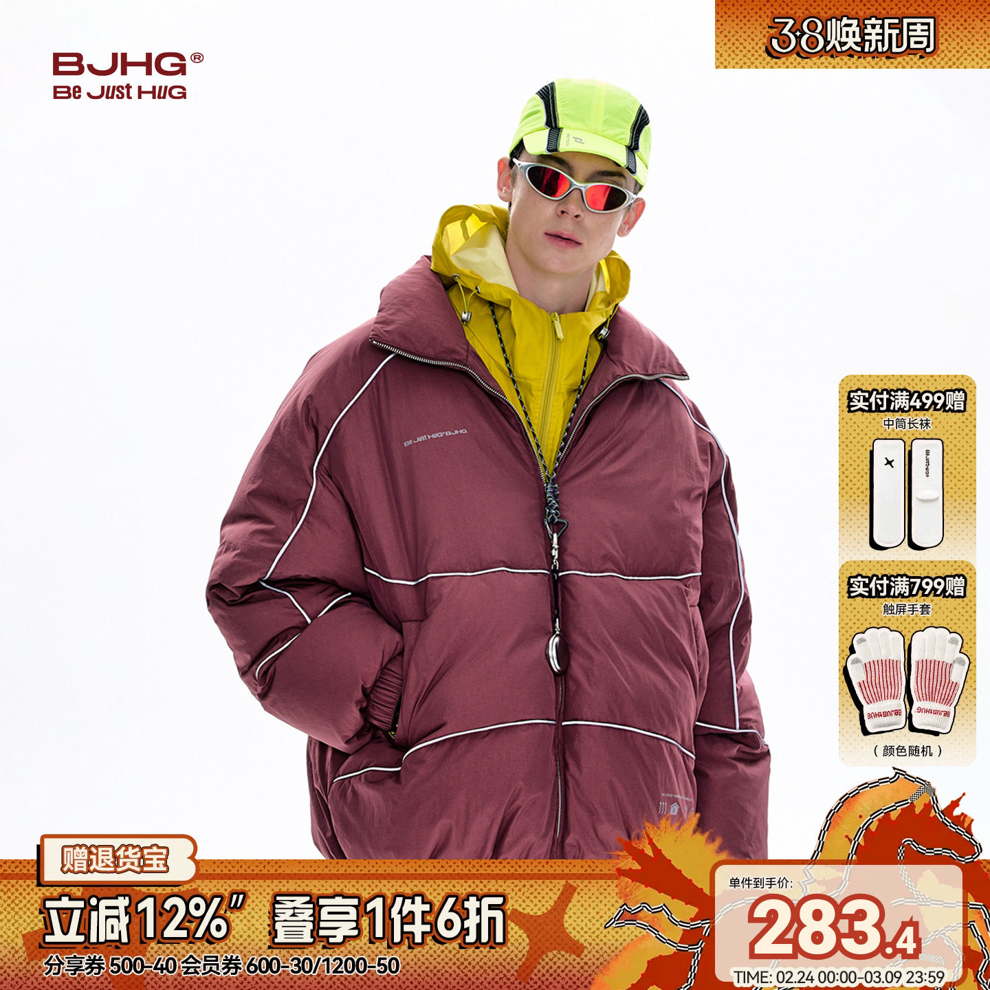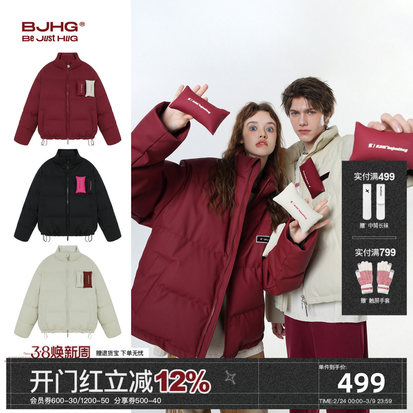 BJHG不计后果新年款红色羽绒服男冬季美式运动风90绒加厚面包服女