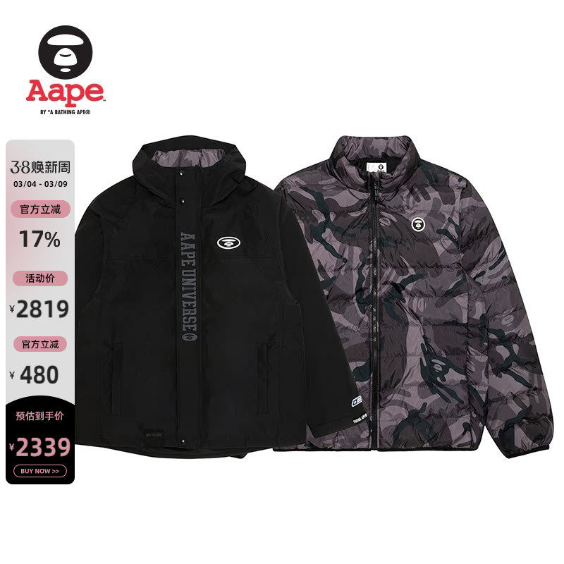 Aape旗舰店男装秋冬可拆卸内胆迷彩潮流红色羽绒服两件套7735XXP