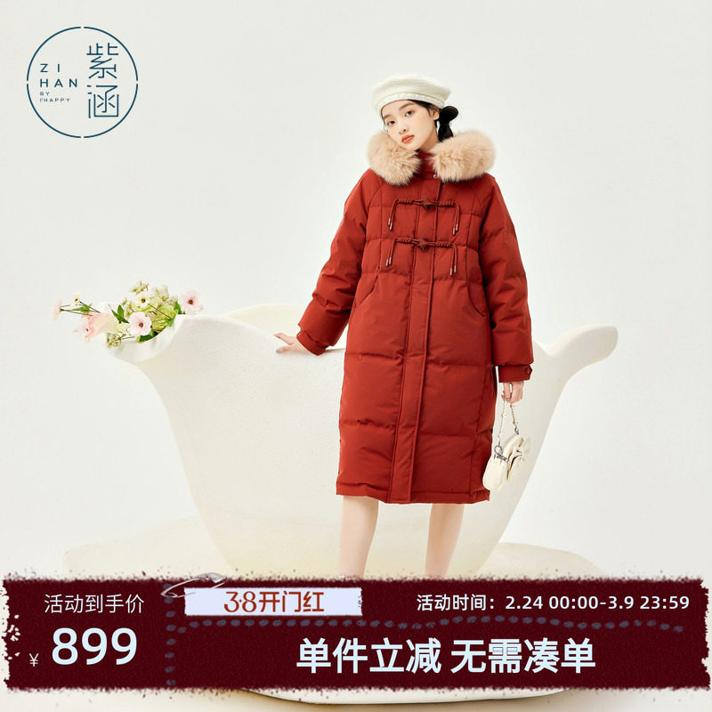 紫涵过膝长款毛领连帽红色羽绒服外套冬季新款宽松保暖鸭绒面包服