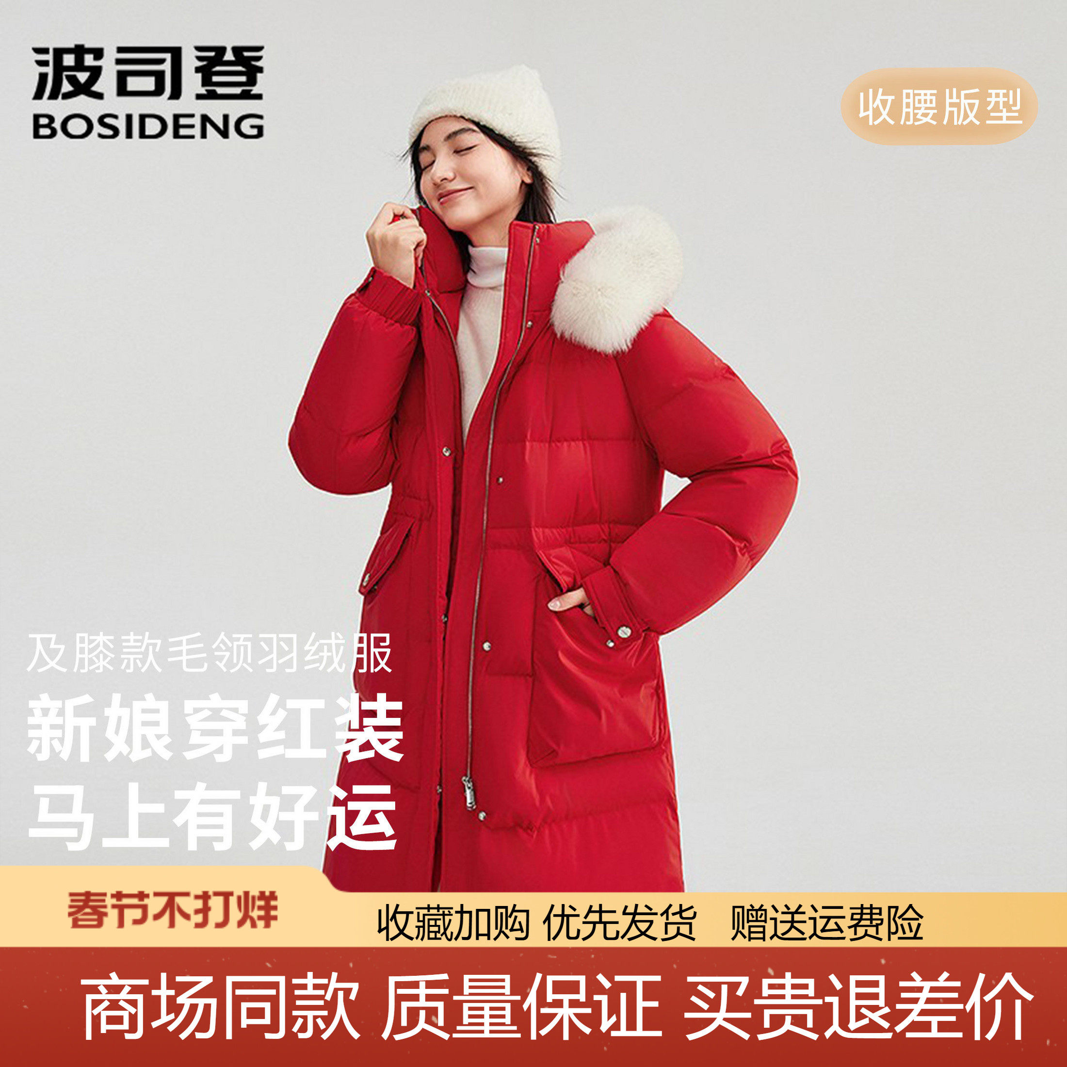 波司登2025新款女过膝长款时尚加厚连帽大毛领新娘结婚红色羽绒服