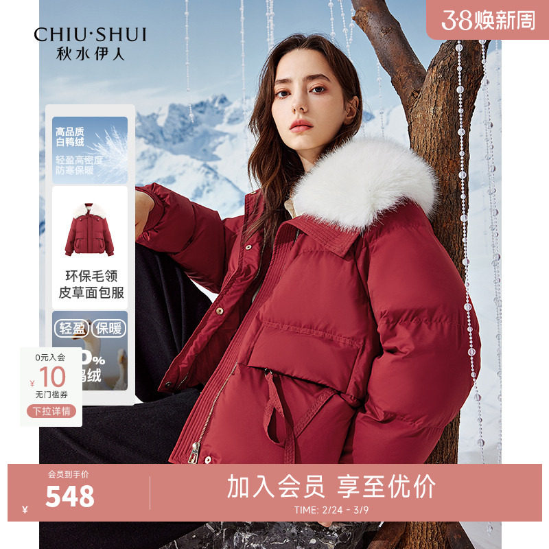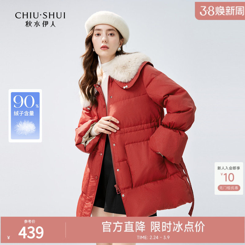 秋水伊人收腰毛领红色羽绒服女2025年冬装新款女装加厚保暖外套