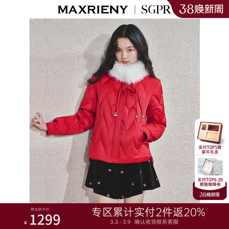 【2件8折】MAXRIENY中式优雅复古毛领棉服红色羽绒服薄款外套
