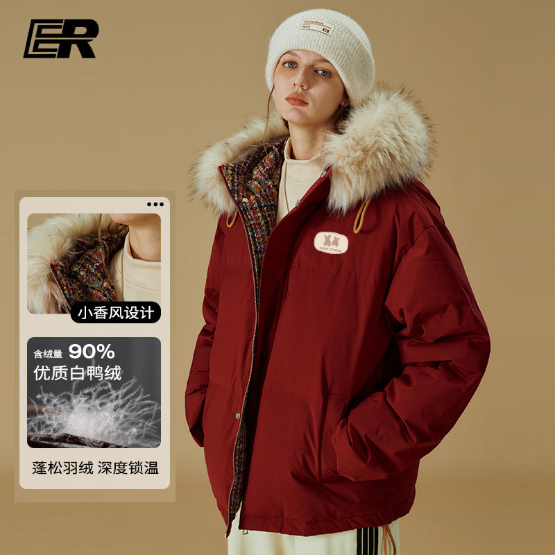 【明星同款】ER小香风毛领连帽红色羽绒服保暖90白鸭绒派克服外套