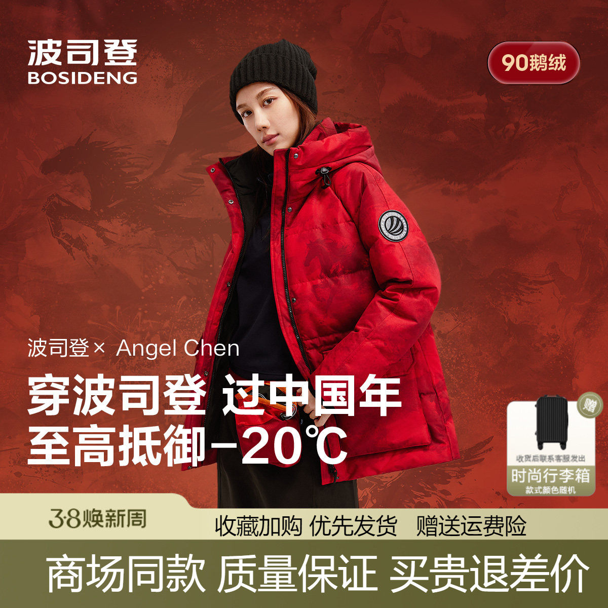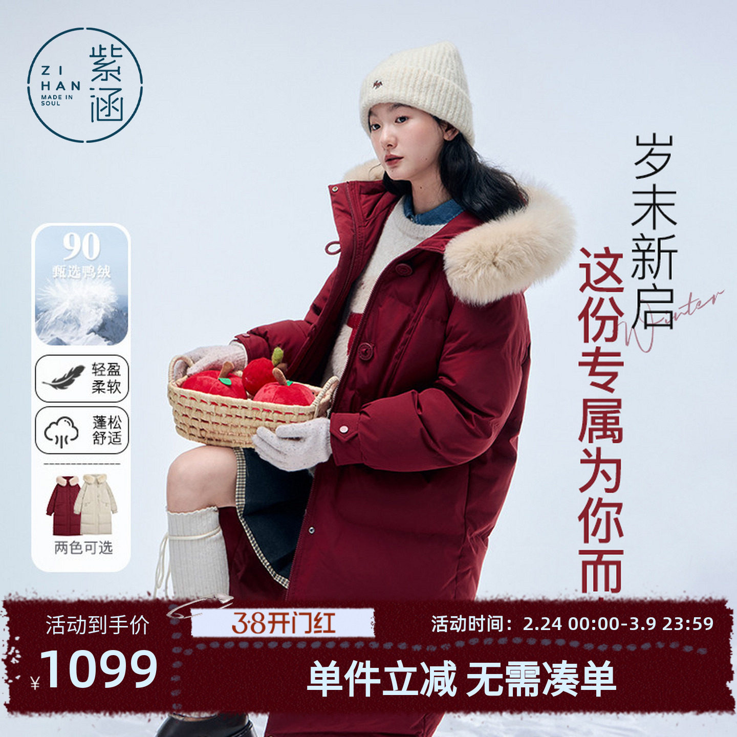 【淘宝百亿补贴官方直播】高奢90白鸭绒红色羽绒服女缎面连帽外套