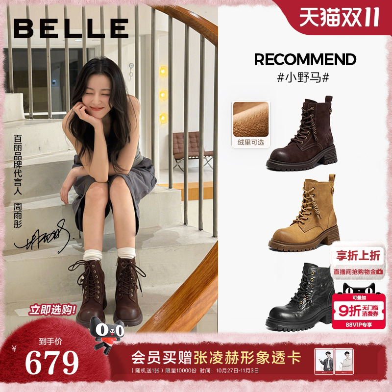 张凌赫周雨彤款百丽小野马英伦风马丁靴子女冬加绒厚底高跟短靴预