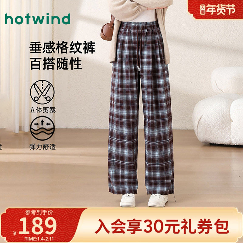 热风女士复古格纹长裤秋冬女款慵懒风宽松阔腿显瘦直筒裤百搭休闲
