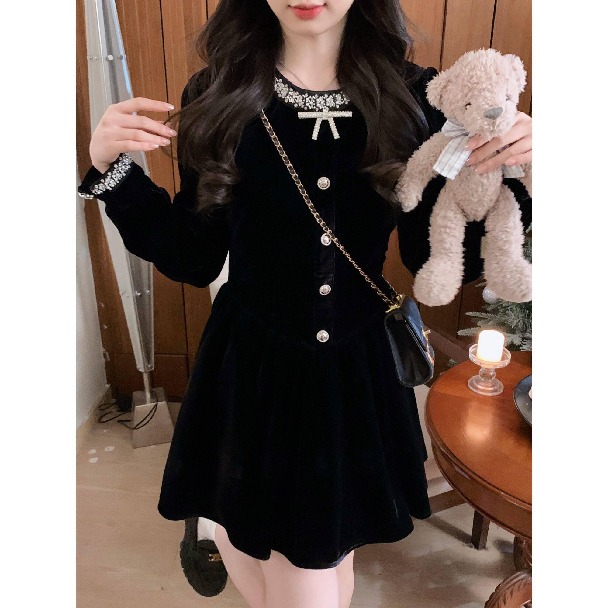 法式名媛小香风气质减龄连衣裙女春秋季新款收腰显瘦小黑裙小个子