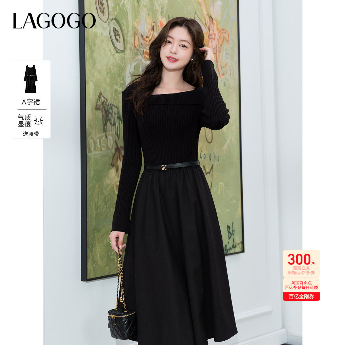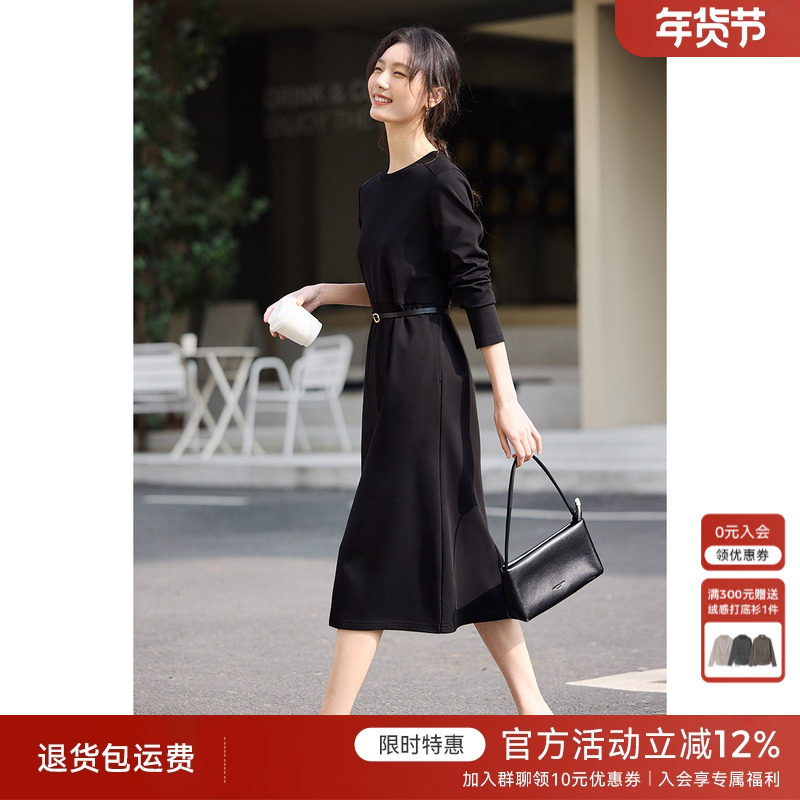 LAGOGO赫本风收腰显瘦小黑裙女拉谷谷2025秋冬新款长袖内搭连衣裙