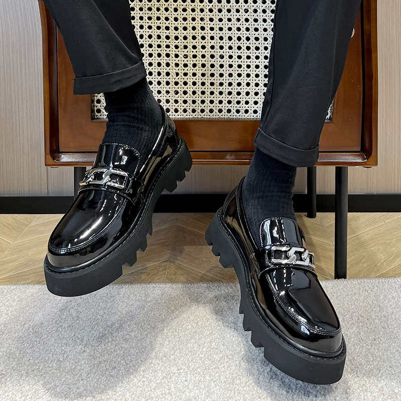 亮面厚底休闲皮鞋男商务百搭男鞋漆皮豆豆鞋男粗跟出差春秋休闲鞋