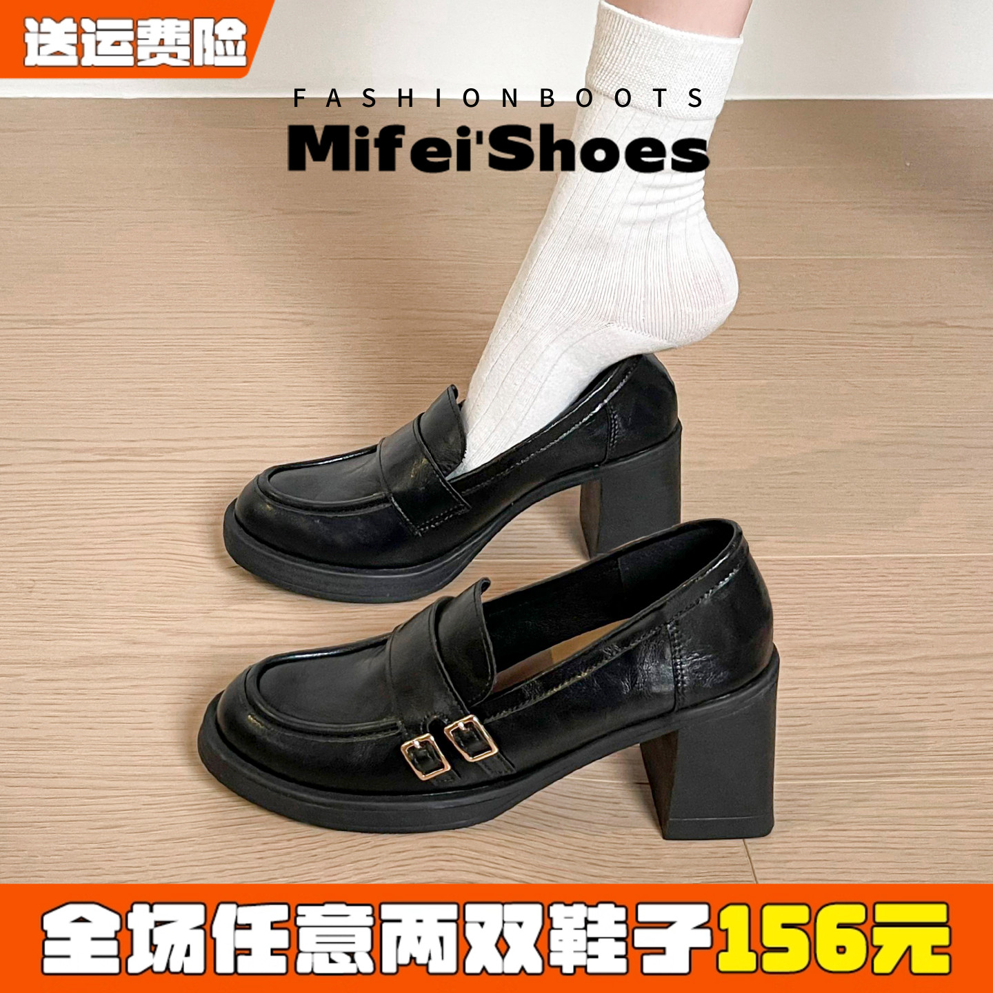 羊皮版~粗跟厚底乐福鞋女2025新款黑色高跟单鞋搭扣英伦风小皮鞋
