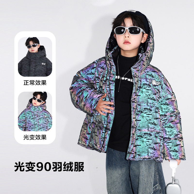 童装男童冬装反光羽绒服2025新款儿童加厚连帽90白鸭绒夜视花外套