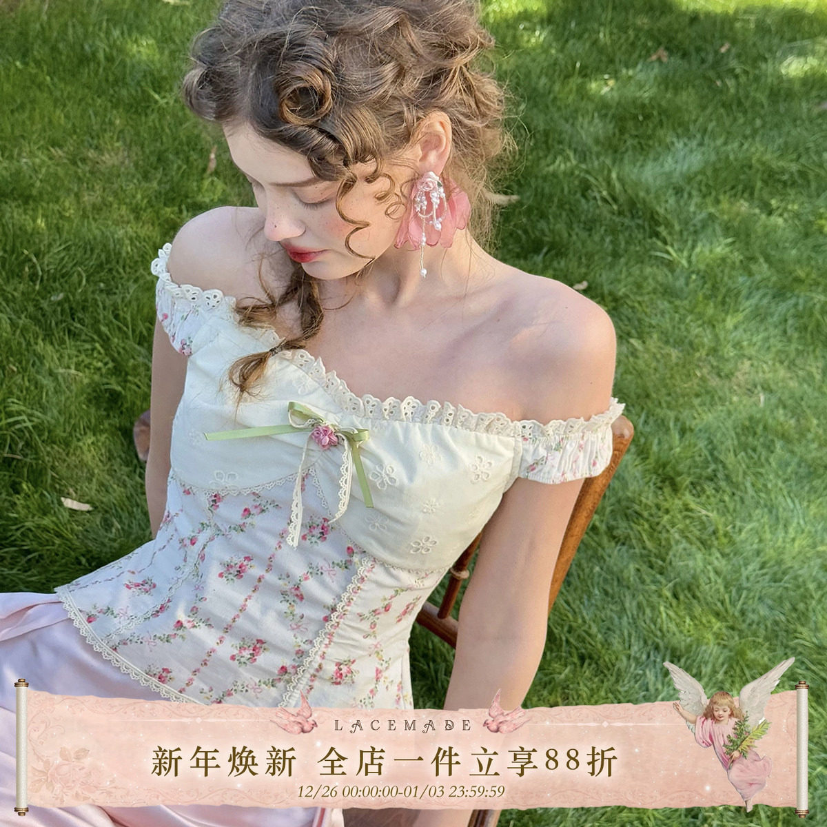 - 一字领蕾丝上衣