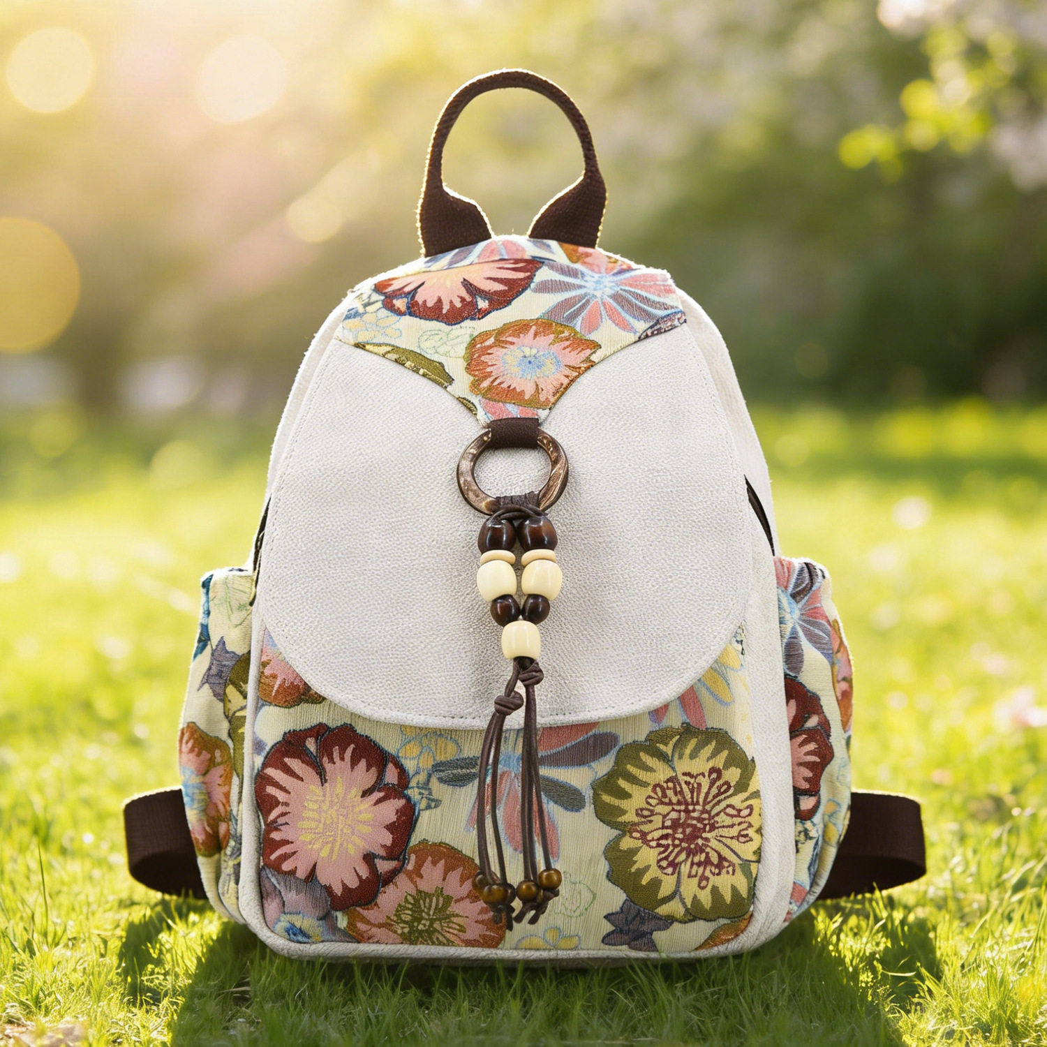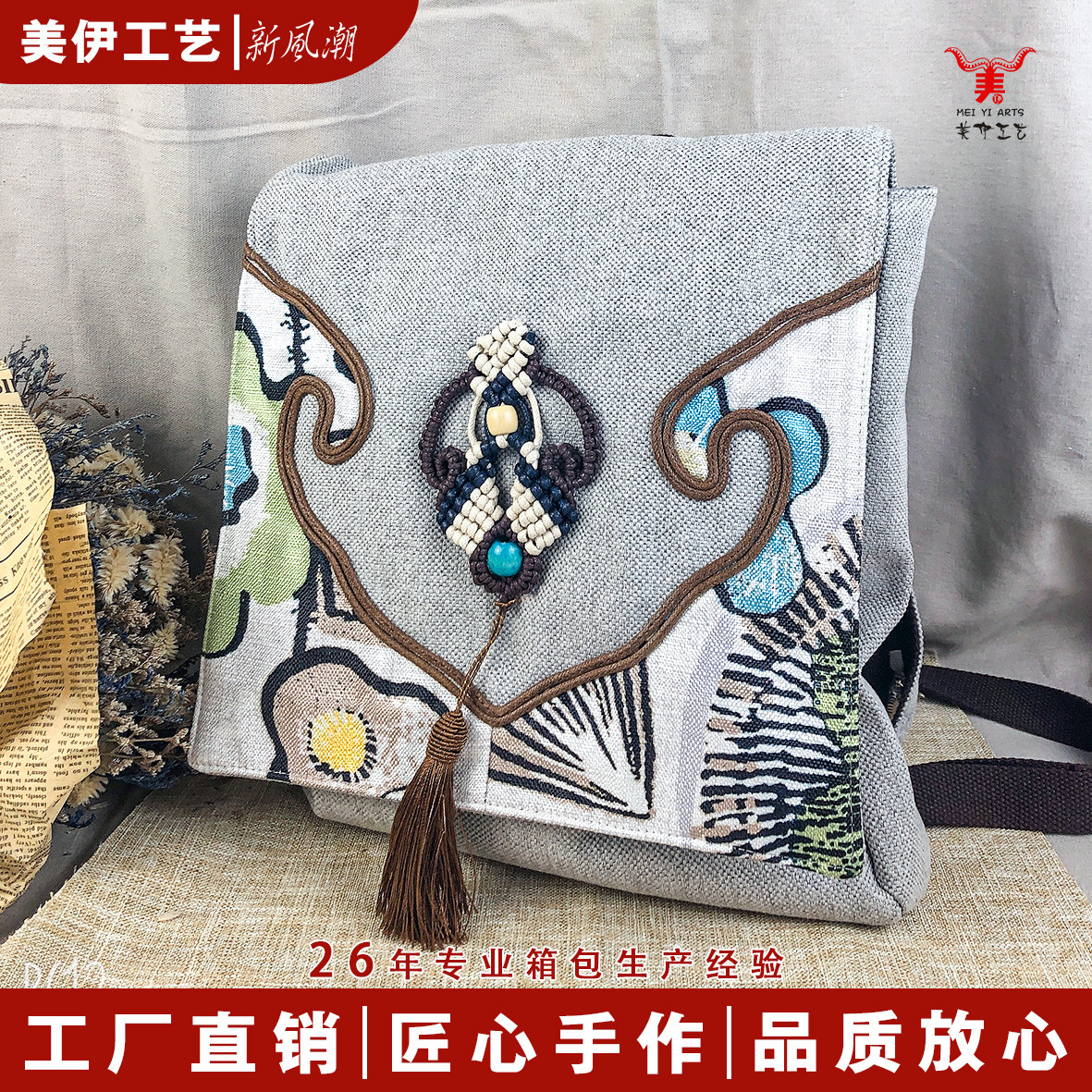 美伊今年新款朴素蜡编如意流苏双肩包女日系风印花大容量休闲包包