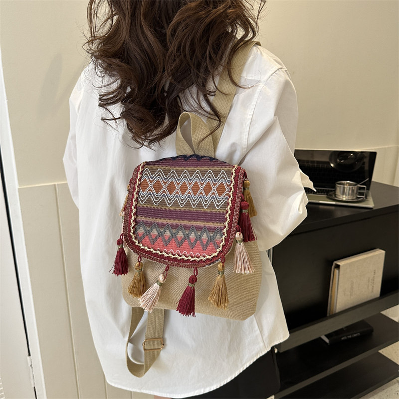 女士短途出行时尚轻便大容量流苏绣线民族风双肩包休闲散步小背包