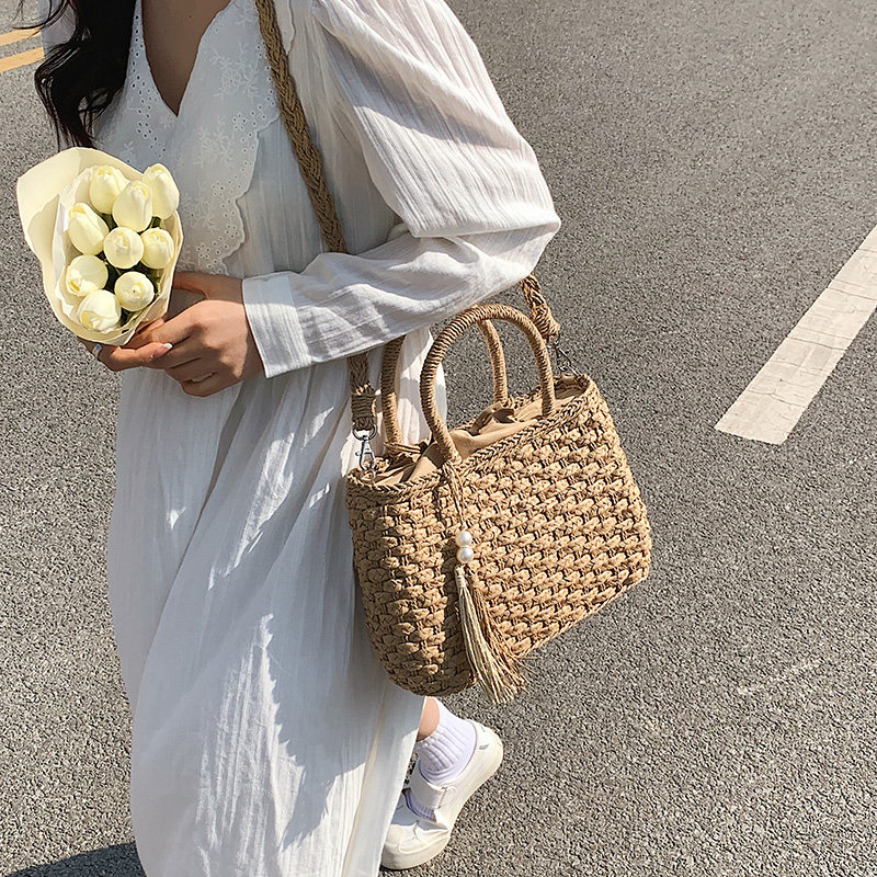 春季新款小清新女包高级感流苏手提包夏日度假风单肩包女生草编包