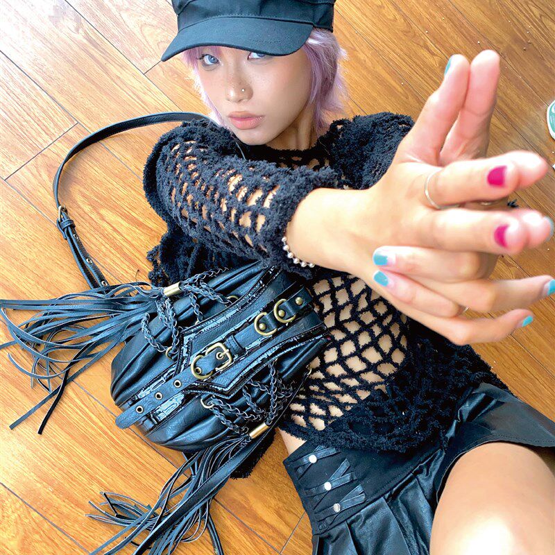 别逃跑 复古风重工辣妹黑色编织磁扣斜跨流苏可调节休闲双肩包女
