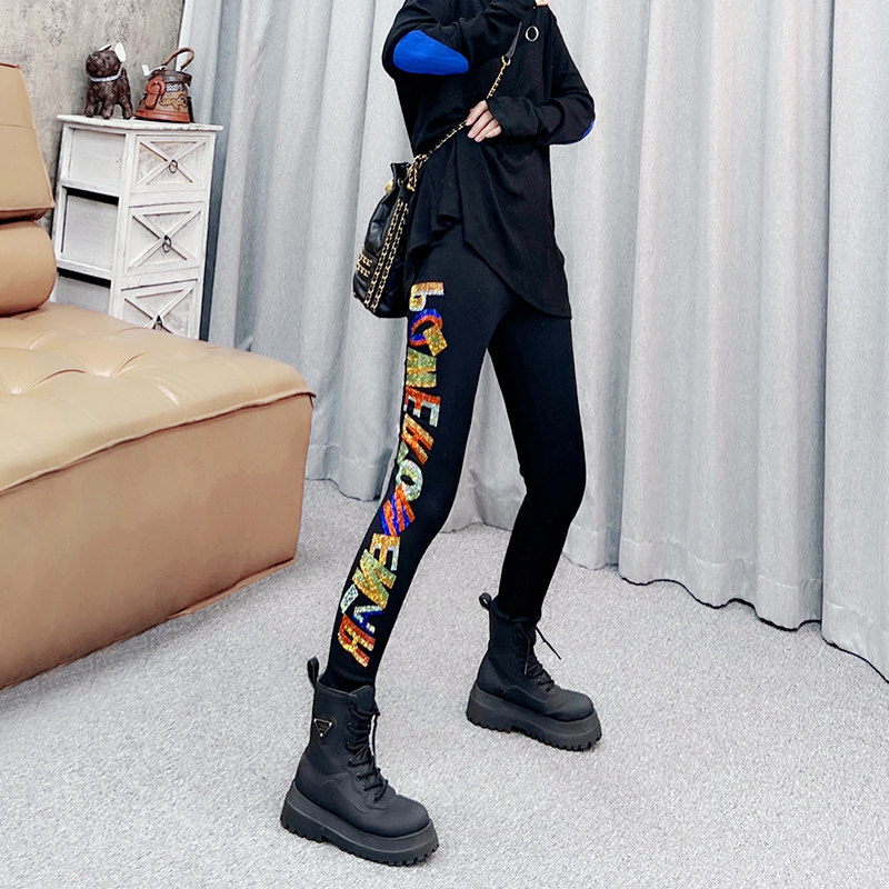 潮牌彩钻打底裤女士外穿加绒加厚彩色字母个性时尚小脚裤镶钻裤子