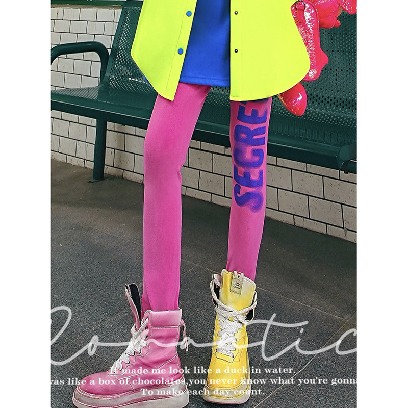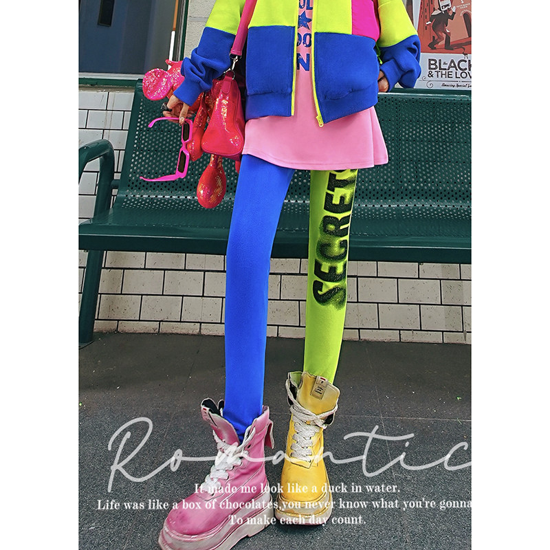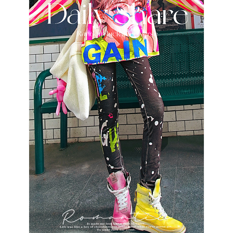 潮牌打底裤女装薄款外穿时尚个性撞色印花彩色裤子紧身小脚九分裤