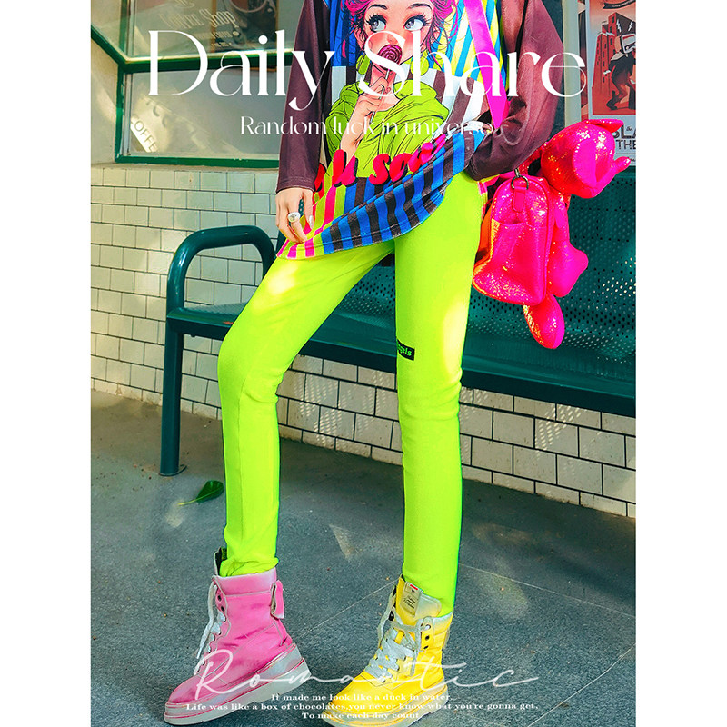 薄款荧光亮色打底裤光滑弹力小脚裤彩色光泽裤网红表演紧身长款女