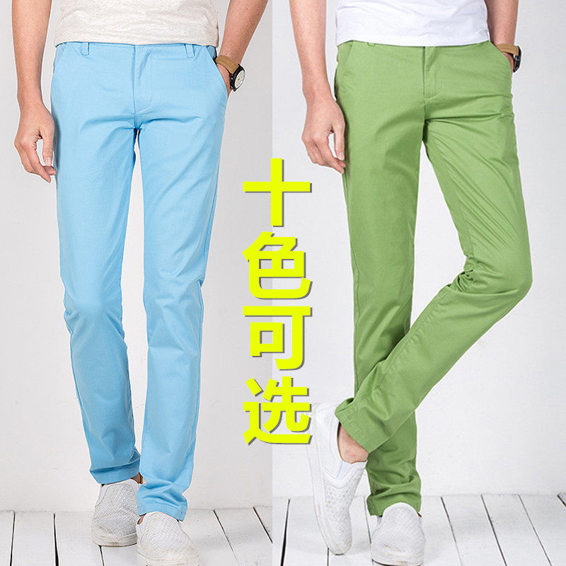 彩色休闲裤男春秋夏弹力大码长裤子潮流糖果纯棉修身直筒小脚裤薄