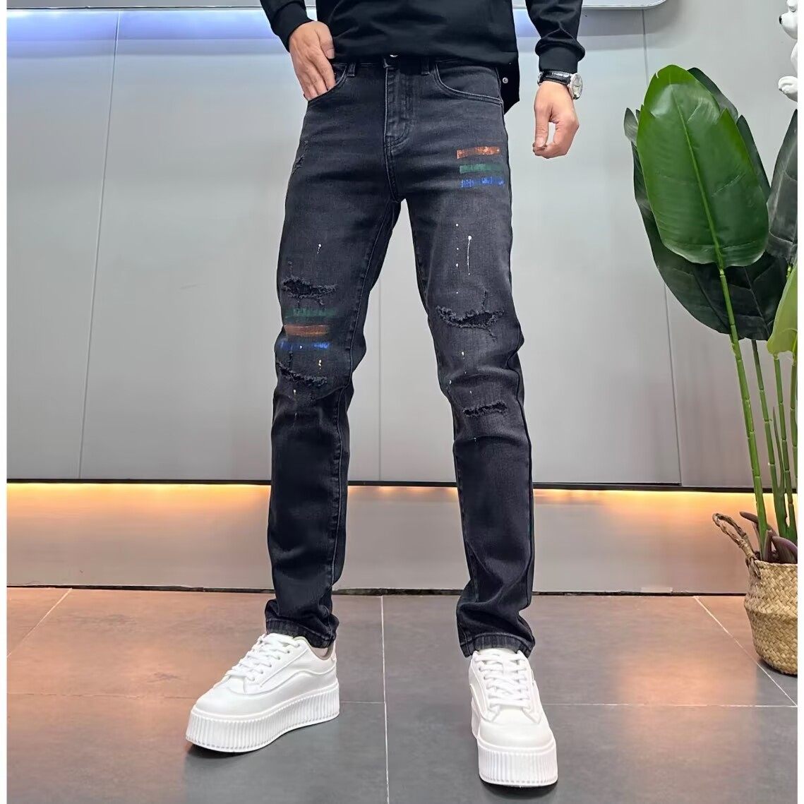 高端彩色印花牛仔裤男修身小脚2025秋冬季新款加绒保暖弹力休闲裤