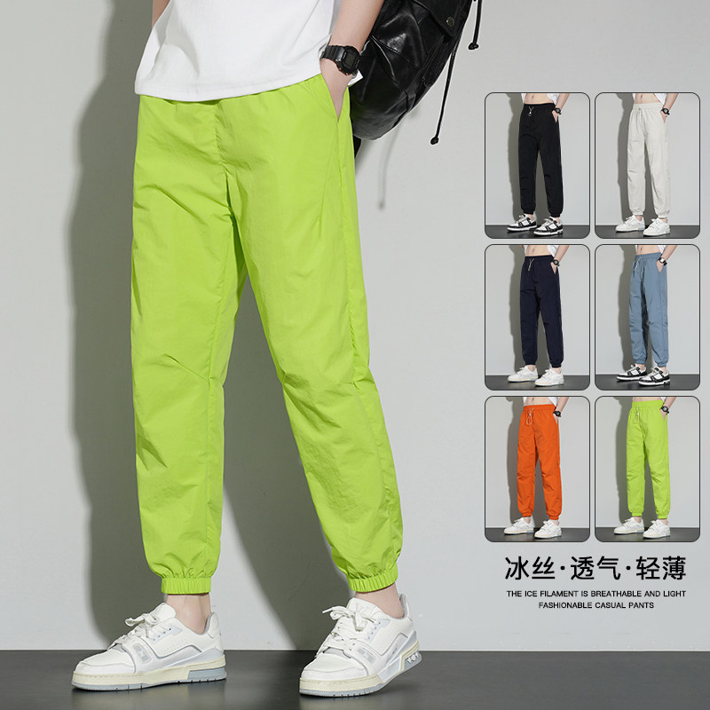 夏季薄款冰丝男士九分休闲裤子彩色小脚橙色直筒宽松弹力束脚凉感