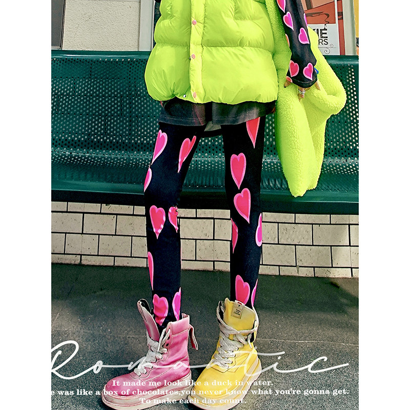 YHAY黑底彩色爱心休闲加绒打底裤秋冬新款显瘦弹力加厚运动小脚裤