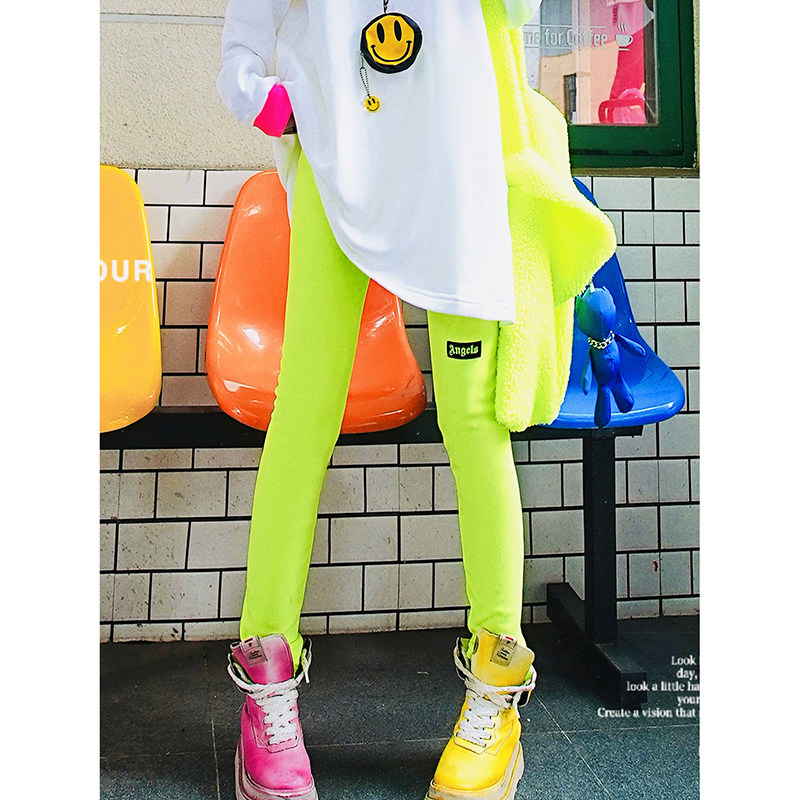 YHAY荧光绿彩色字母贴布休闲加厚加绒打底裤冬新款弹力运动小脚裤