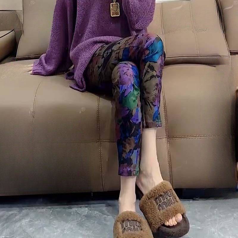 2025新款春秋薄款打底裤女外穿高腰彩色印花紧身显瘦九分小脚裤子
