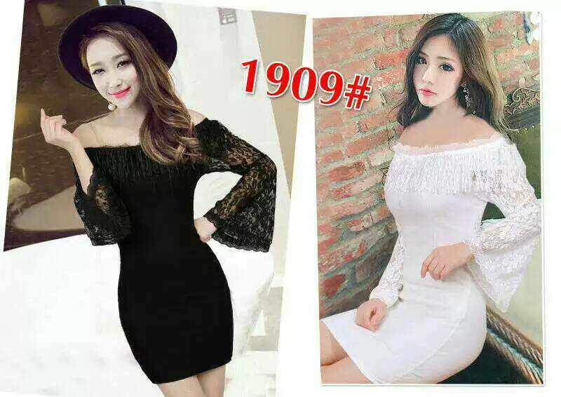 HP:相见淡蓝*辣妹性感一字肩连衣裙女夜场紧身蕾丝长袖包臀睡裙