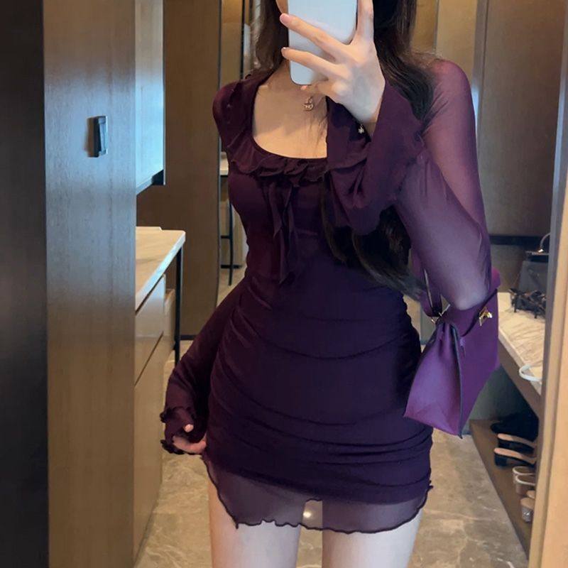大码胖mm纯欲风性感紫色裙子夜店长袖秋冬连衣裙设计感包臀短裙女