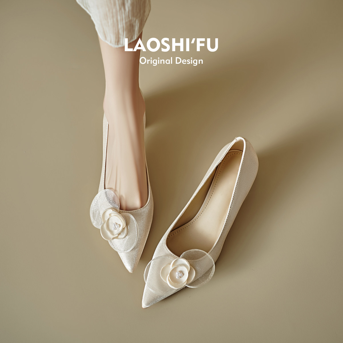 羊皮版!法式气质花朵尖头高跟女不累脚伴娘鞋新娘鞋婚鞋细跟单鞋