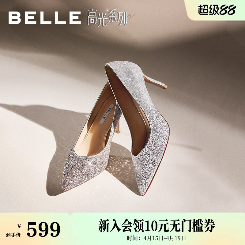 百丽细闪优雅细高跟单鞋女26新款宴会新娘结婚鞋浅口单鞋BDAY7AQ6