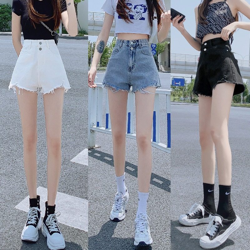 黑灰色毛边牛仔短裤女破洞夏季2025新款宽松显瘦高腰a字辣妹热裤