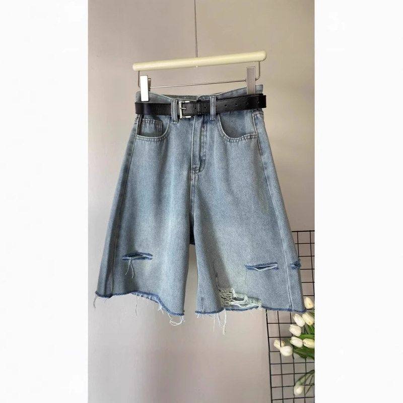 欧货浅色破洞牛仔短裤女夏宽松高腰显瘦港味直筒中裤阔腿裤五分裤