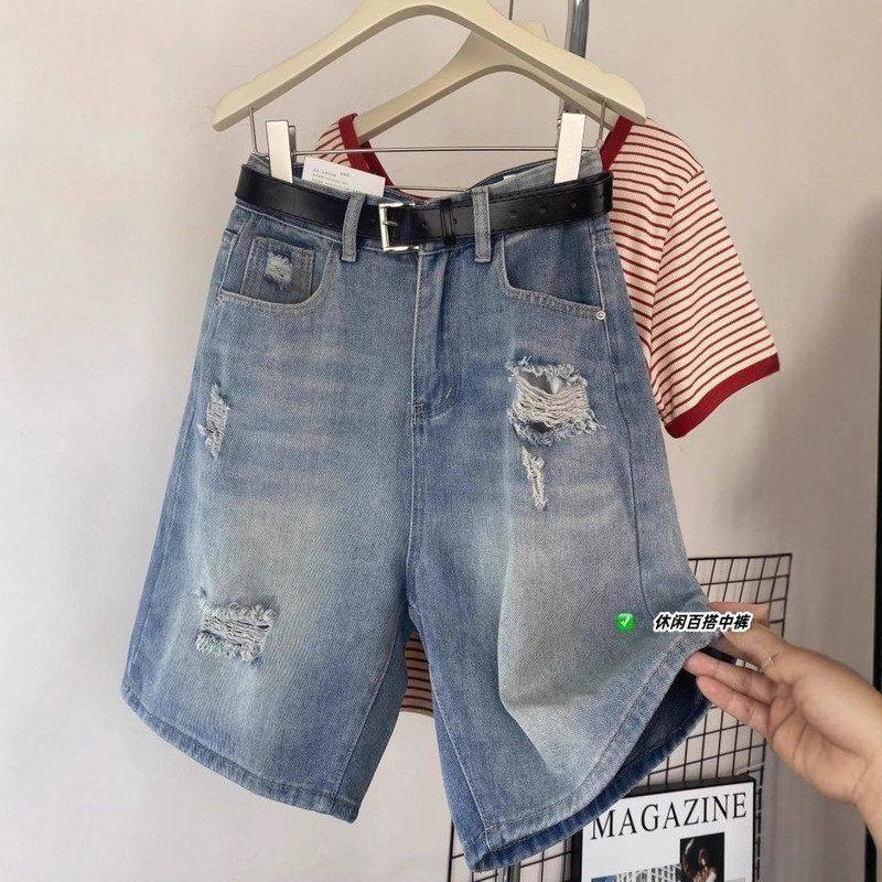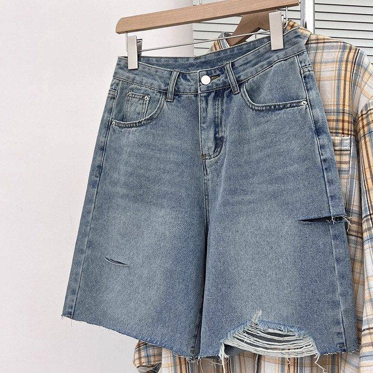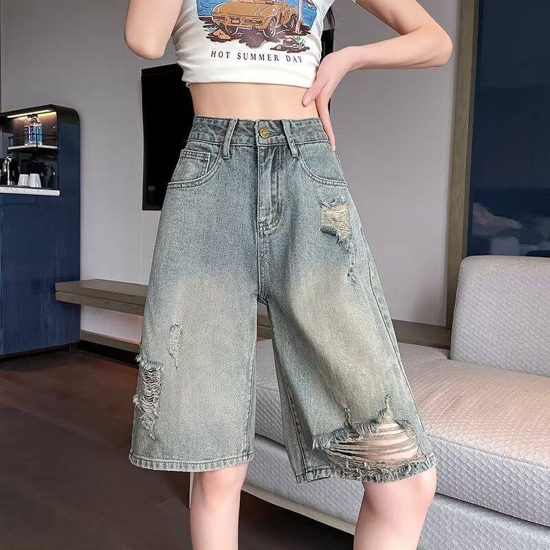 复古破洞牛仔短裤女夏季2025新款高腰宽松显瘦遮肉直筒五分中裤薄