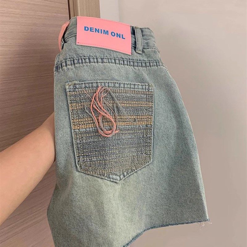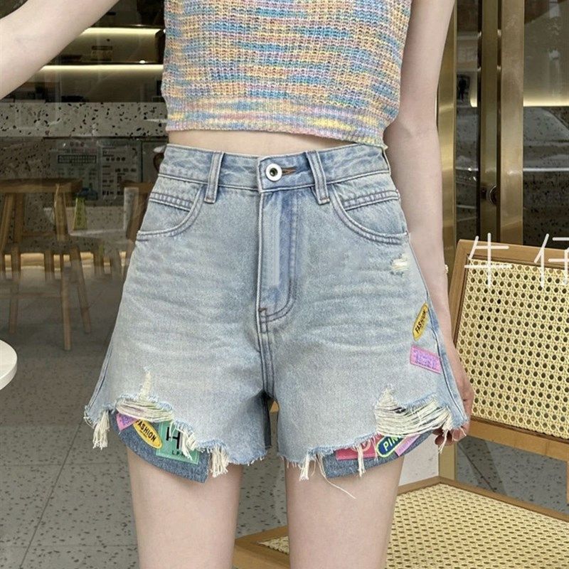 破洞牛仔短裤女夏季薄款高腰宽松显瘦A字小个子设计感贴布热裤潮