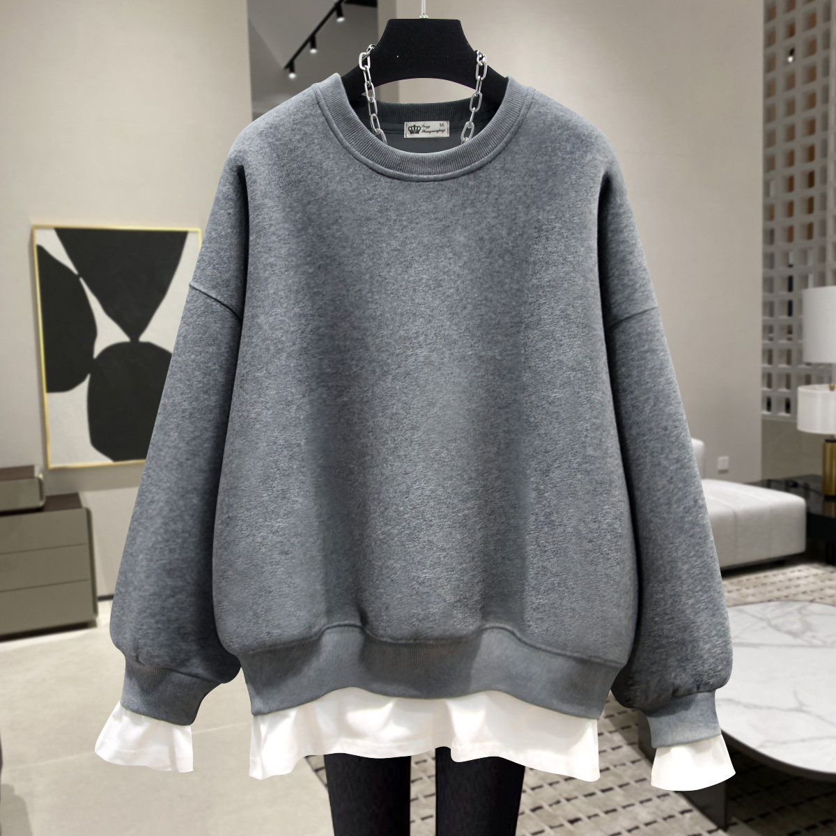 小个子纯色爆款假两件卫衣女加绒2025新款深灰色慵懒风圆领上衣
