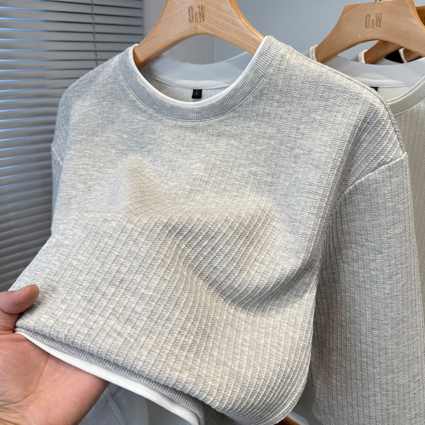 假两件圆领卫衣男款秋冬季肌理感加厚套头上衣服宽松t恤长袖纯色