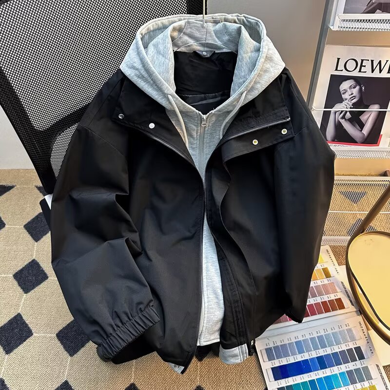 假两件卫衣外套男女通勤春秋美式简约纯色连帽工装夹克潮牌冲锋衣