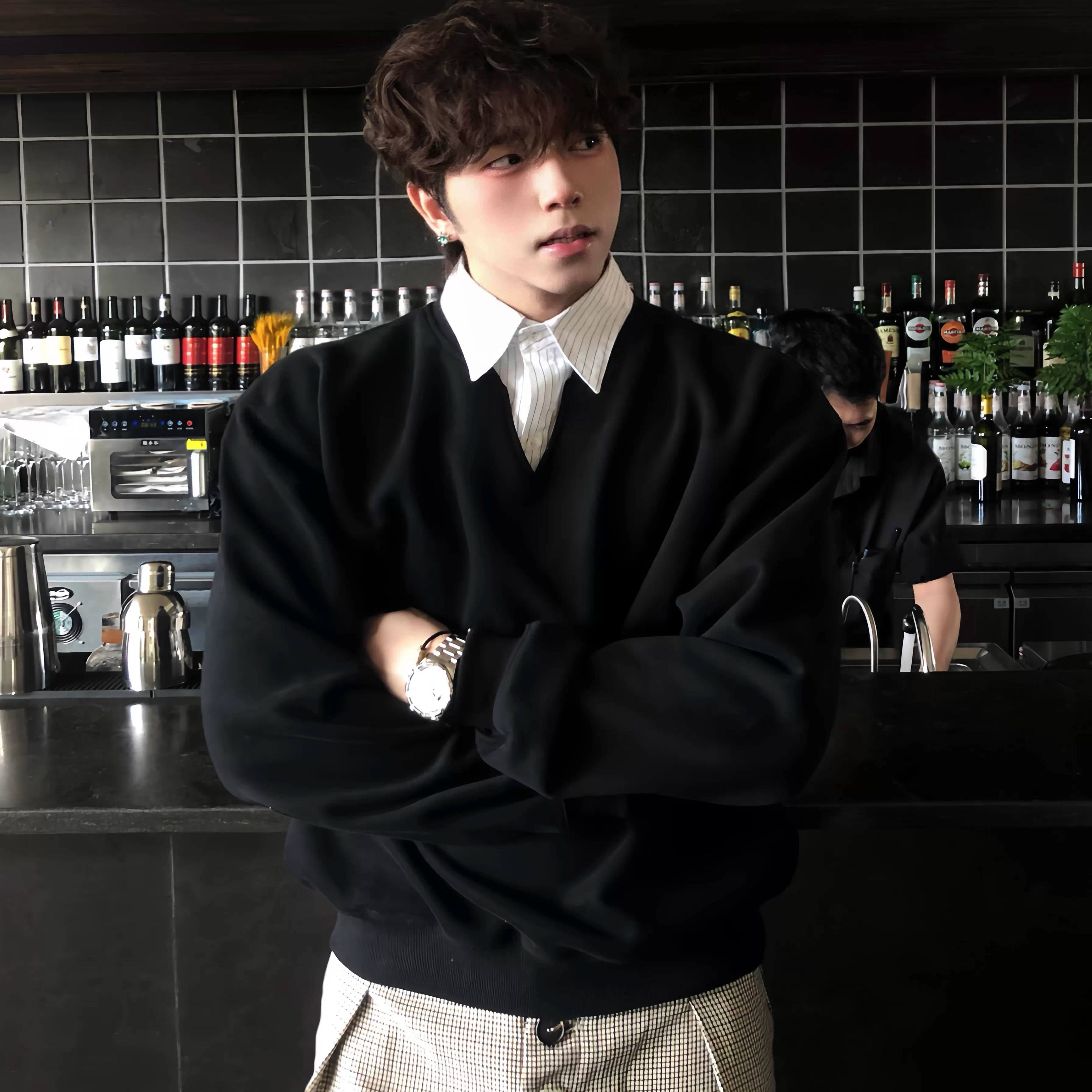 韩系穿搭假两件V领卫衣男cleanfit纯色百搭叠穿打底衫秋冬长袖tee