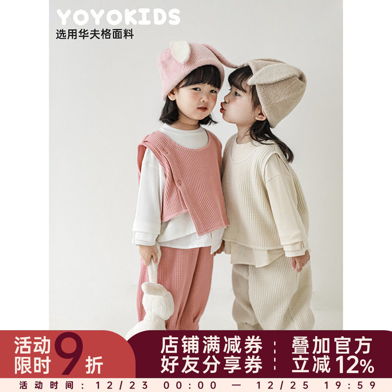 幼悠女童纯色卫衣华夫格纹理时尚假两件马甲宝宝秋冬保暖三件套潮