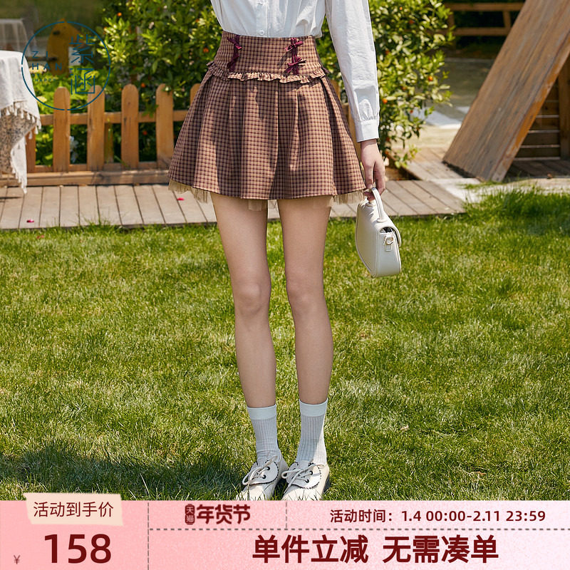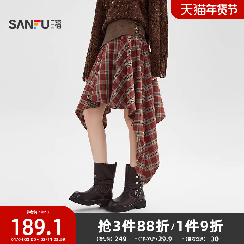三福格子短裙2025新款冬季复古超好看的不规则摆半身裙女装513692