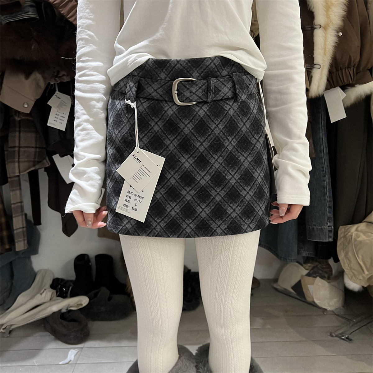 PLNH2025冬季新款韩版时尚设计感高腰宽松显瘦毛呢加绒格子短裙女